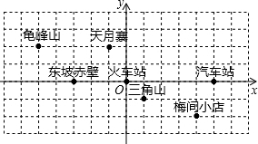 解答:解:如图,东坡赤壁:(-3,0),三角山:(1,-1),天月寨:(-1,2),龟峰山(-5,2).