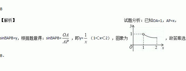 如图,圆O的半径为1,AD,BC是⊙O的两条互相垂直的直径,点P从点O出发(P点与O点不重合),沿O→C→D的路线运动,设AP=x,sin∠APB=y,那么y与x之间的关系图象大致是( )