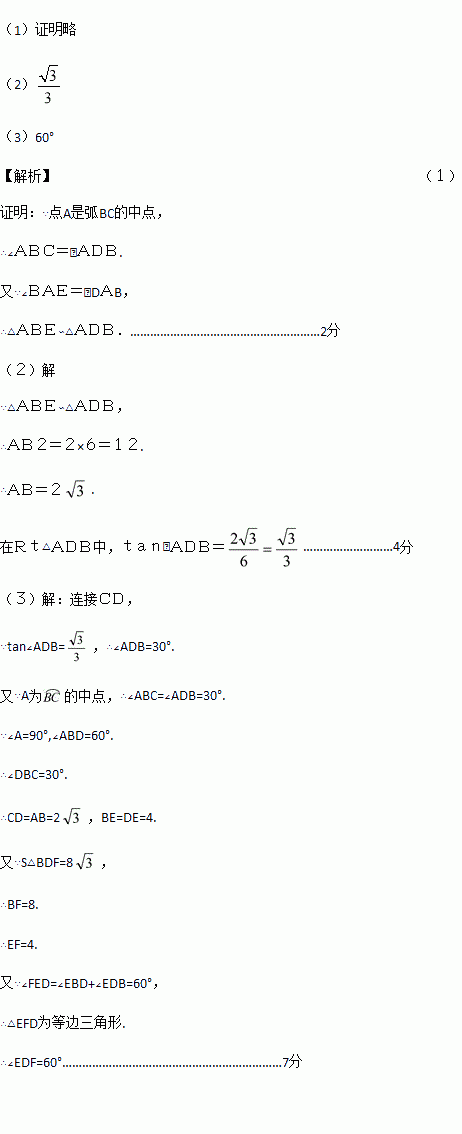 如图,BD为⊙O的直径,点A是弧BC的中点,AD交BC于E点,AE=2,ED=4. ![]()