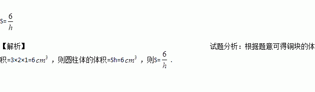 把一个长、宽、高分别为3cm、2cm、1cm的长方体铜块铸成一个圆柱体铜块,则该圆柱体铜块的底面积S(cm2)与高h(cm)之间的函数关系式为_________.