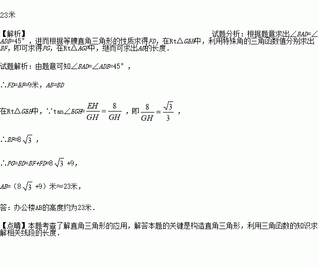 如图,在办公楼AB和实验楼CD之间有一旗杆EF,从办公楼AB顶部A点处经过旗杆顶部E点恰好看到实验楼CD的底部D点,且俯角为45°,从实验楼CD顶部C点处经过旗杆顶部E点恰好看到办公楼AB的G点,BG=1米,且俯角为30°,已知旗杆EF=9米,求办公楼AB的高度.(结果精确到1米,参考数据:
