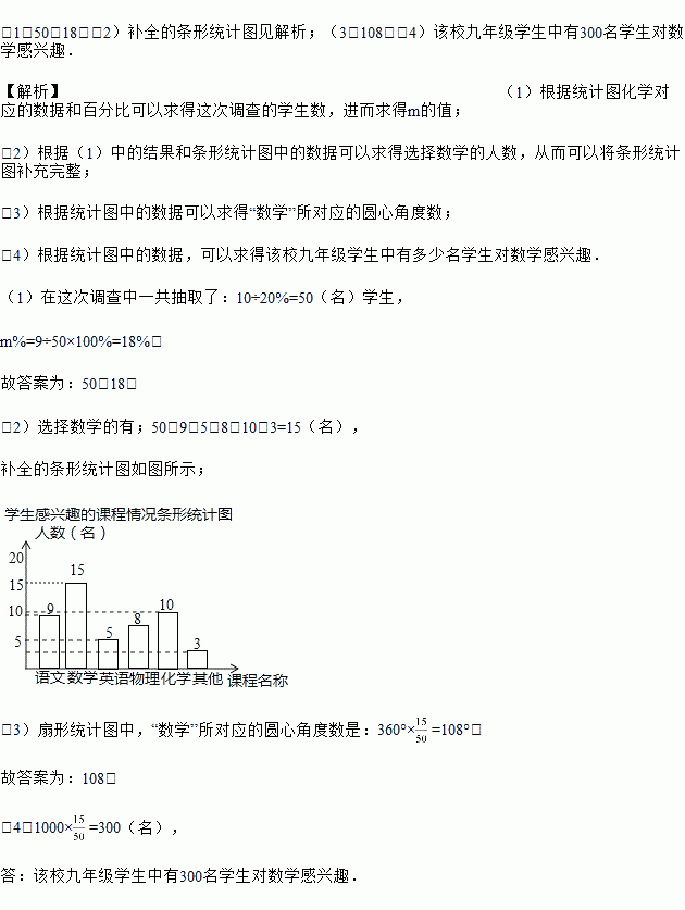 (4)若该校九年级共有1000名学生,根据抽样调查的结果,请你估计该校九年级学生中有多少名学生对数学感兴趣.
