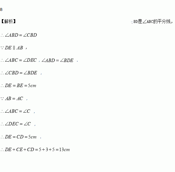 如图,在△ABC中,AB=AC,D,E两点分别在AC, BC上,BD是∠ABC的平分线,DE//AB,若BE=5 cm,CE=3 cm,则△CDE的周长是( )
