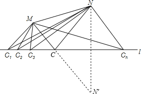 如图,城市M与城市N在运河l的同侧,运河沿线有无数个港口C1、C2、C3、…、Cn…某快递公司新增项目A,计划在M城、N城和某港口间,开通一条常用运输路线,为计算运输成本,以此三点形成的三角形周长作为项目A的基本长度.