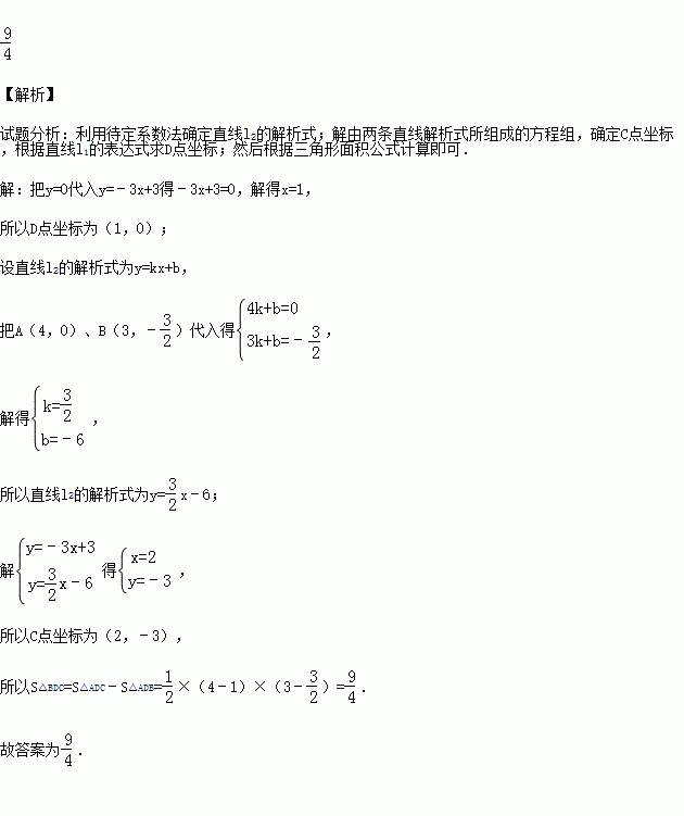 (2015秋•福田区期末)如图,直线l1的表达式为y=﹣3x+3,且直线l1与x轴交与点D,直线l2经过点A、B,且与直线l1交于点C,则△BDC的面积为 .
