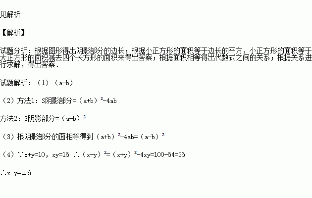 (4)根据(3)题中的等量关系,解决问题:若x+y=10,xy=16,求x-y的值.