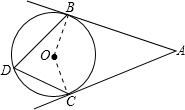分析:连接OB,OC,由AB与AC为圆O的切线,根据切线的性质得到AB垂直于OB,AC垂直于OC,在四边形ABOC中,由∠BAC的度数,以及两个角为直角,利用四边形的内角和定理求出∠BOC的度数,再利用同弧所对的圆周角等于所对圆心角的一半,可得出所求角的度数.