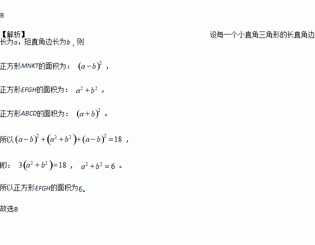 中国数学史上最先完成勾股定理证明的数学家是公元3世纪三国时期的赵爽,他为了证明勾股定理,创制了一幅“弦图”,后人称其为“赵爽弦图”(如图1).图2由弦图变化得到,它是用八个全等的直角三角形拼接而成.将图中正方形MNKT,正方形EFGH,正方形ABCD的面积分别记为S1,S2,S3,若S1+S2+S3=18,则正方形EFGH的面积为( )