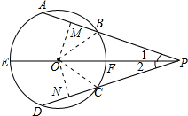 如图,P为⊙O的直径EF延长线上一点,PA交⊙O于点A,B,PC交⊙O于点C,D,且∠1=∠2.