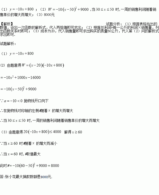 (3)Ëæ×Å׬µÄǮԽÀ´Ô½¶à,ÕÅС»¨¾ö¶¨»ØÀ¡Éç»á½«Ò»ÖܵÄÏúÊÛÀûÈóÈ«²¿¾è¸øÏåÑôÊи£ÀûÔº.ÈôÒ»ÖÜÕÅС»¨µÄ×ܳɱ¾²»³¬¹ý4000Ôª,ÇëÇó³öÕÅС»¨×î´ó¾è¿îÊý¶îÊǶàÉÙÔª?