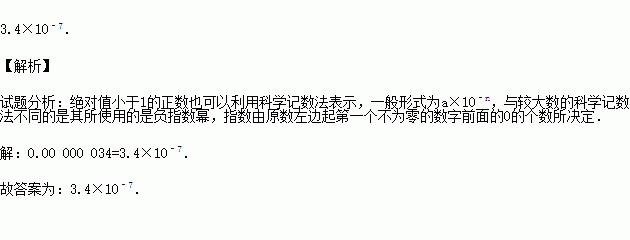 (2015秋•禹州市期末)石墨烯是目前世界上最薄却是最坚硬的纳米材料,同时也是导电性最好的材料,其理论厚度仅0.00000034毫米,将0.00000034用科学记数法表示应为 .