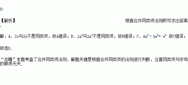 A. 2x+2y=4xy B. 2a2+2a3=2a5 C. 4a2﹣3a2=1 D. ﹣2ba2+a2b=﹣a2b