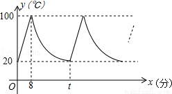 小明家饮水机中原有水的温度为20℃,通电开机后,饮水机自动开始加热[此过程中水温y(℃)与开机时间x(分)满足一次函数关系],当加热到100℃时自动停止加热,随后水温开始下降[此过程中水温y(℃)与开机时间x(分)成反比例关系],当水温降至20℃时,饮水机又自动开始加热…,重复上述程序(如图所示),根据图中提供的信息,解答下列问题: