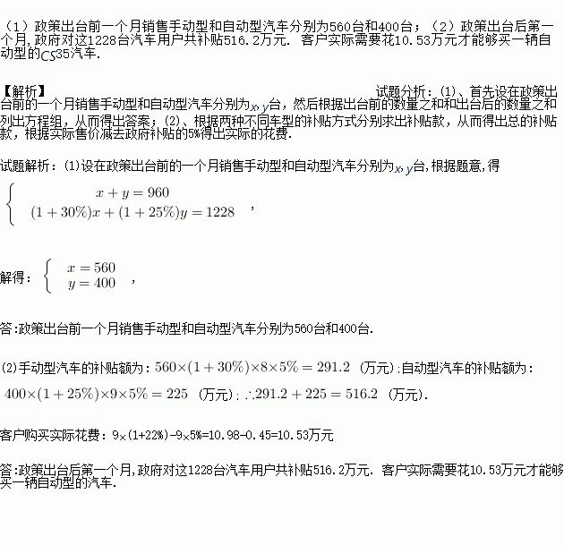 (2)若手动型汽车每台价格为8万元,自动型汽车每台价格为9万元.根据汽车补贴政策,政府按每台汽车价格的5%给购买汽车的用户补贴,购车人需要交纳车辆购置各种税费杂费路桥保险等为每台汽车价格的22%,问政策出台后的第一个月,政府对这l228台汽车用户共补贴了多少万元?客户实际需要花多少钱才能够买一辆自动型的CS35汽车?