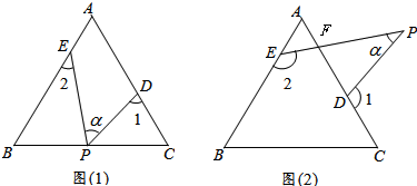 在等边△ABC中,点D、E分别是边AC、AB上的点(不与A、B、C重合),点P是平面内一动点.设∠PDC=∠1,∠PEB=∠2,∠DPE=∠a.