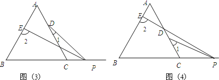 (1)若点P在边BC上运动(不与点B和点C重合),如图(1)所示.则∠1+∠2=