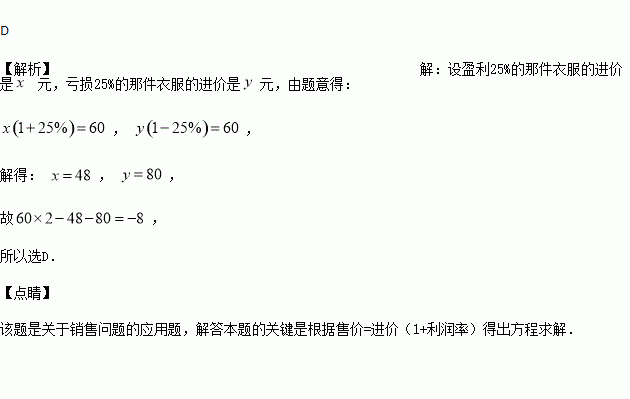 ÔÚ´º½Úµ½À´Ö®¼Ê£¬Ä³Í¯×°ÍƳöϵÁл£¬Ò»Î»ÂèÂè¿´ºÃÁ½¼þÒ·þ£¬ËýÏë¸øº¢×Ó¶¼ÂòÏÂÀ´×÷ΪÐÂÄêÀñÎÓëµêÔ±ÉÌÁ¿Ï£Íû¶¼ÒÔ60ÔªµÄ¼Û¸ñÂô¸øËý.ÏúÊÛÔ±·¢ÏÖÕâÑùÒ»¼þ¾Í»áÓ¯Àû25%£¬ÁíÒ»¼þ¾Í»á¿÷Ëð25%£¬µ«ÊÇÂô³öÕâÁ½¼þÒ·þ×ܵÄÊÇÓ¯Àû»¹ÊÇ¿÷Ëð»òÊDz»Ó¯²»¿÷ÄØ£¿ÇëÄãÓÃѧ¹ýµÄ֪ʶ°ï×ÅÅжÏһϣ¨ £©