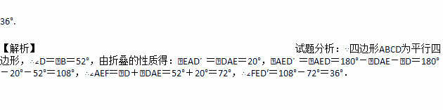 如图,在□ABCD中,E为边CD上一点,将△ADE沿AE折叠至△AD′E处,AD′与CE交于点F.若∠B=52°,∠DAE=20°,则∠FED′的大小为__________.