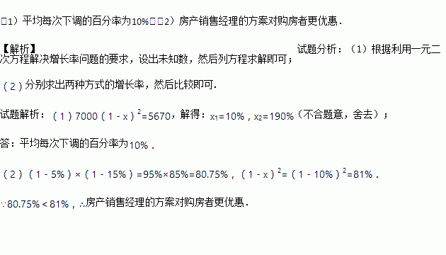 某中心城市有一楼盘,开发商准备以每平方米7000元价格出售,由于国家出台了有关调控房地产的政策,开发商经过两次下调销售价格后,决定以每平方米5670元的价格销售.