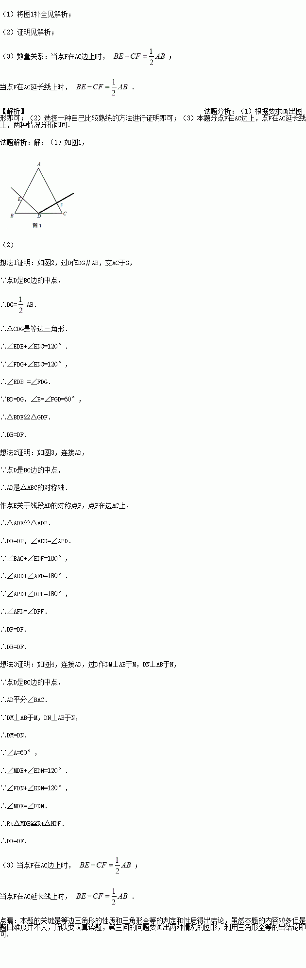 在△ABC中,AB=AC,∠A=60°,点D是BC边的中点,作射线DE,与边AB交于点E,射线DE绕点D顺时针旋转120°,与直线AC交于点F.