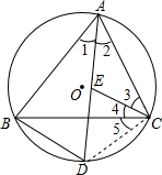 分析 连接CD,由AD平分∠BAC交⊙O于D得∠1=∠2,根据圆周角定理得$\widehat{BD}$=$\widehat{CD}$,则BD=CD,再利用CE平分∠ACB交AD于点E,可得∠3=∠4,然后证明∠CED=∠DCE,根据等腰三角形的判定得到CD=ED,即BD=ED.