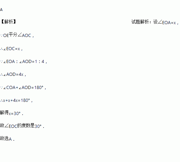 直线AB、CD相交于点O,OE平分∠AOC,∠EOA:∠AOD=1:4,则∠EOC等于( )