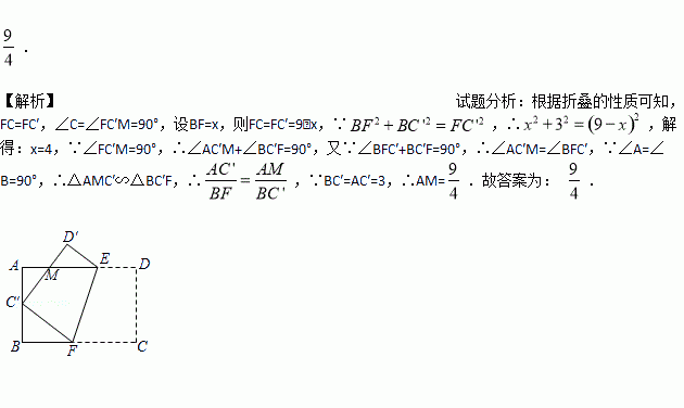 如图,将矩形ABCD沿EF折叠,使顶点C恰好落在AB边的中点C’上,点D落在D’处,C'D’交AE于点M.若AB=6,BC=9,则AM的长为_____.