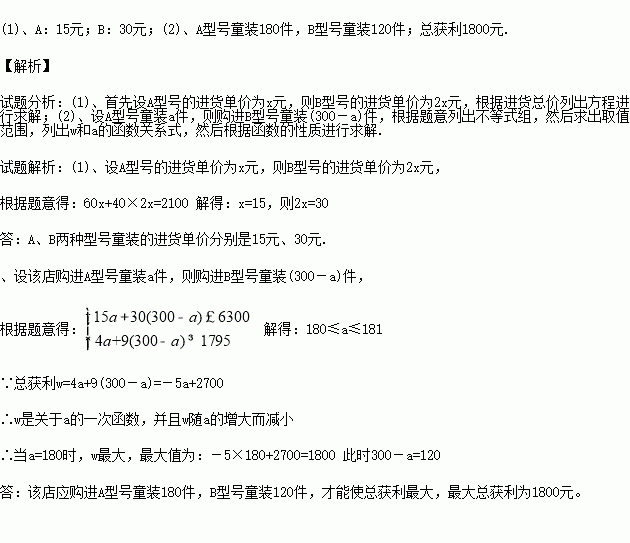 某儿童服装店欲购进A、B两种型号的儿童服装.经调查:B型号童装的进货单价是A型号童装的进货单价的两倍,购进A型号童装60件和B型号童装40件共用去2100元.