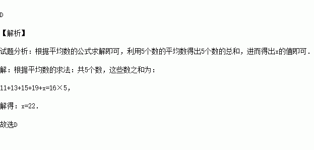(2015秋•迁安市期末)近年来,我市民用汽车拥有量持续增长,自2011年民用汽车拥有量依次约为:11,13,15,19,x(单位:万辆),这五个数的平均数为16,则x的值为( )