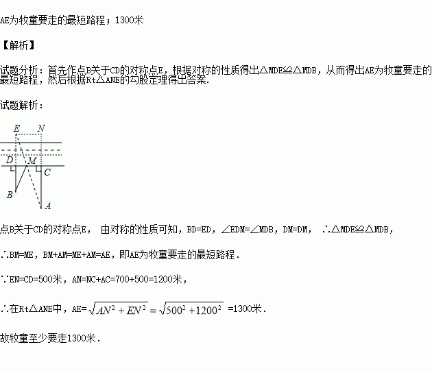 如图,草原上,一牧童在A处放马,牧童家在B处,A、B处距河岸的距离AC,BD的长分别为500m和700m,且CD=500m,天黑前牧童从A点将马牵到河边去饮水后,再赶回家,牧童将马牵到河边什么地方饮水,才能使走过的路程最短?牧童最少要走多少m?