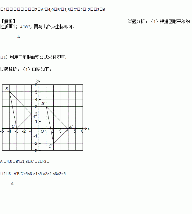 如图,将△ABC向右平移5个单位长度,再向下平移2个单位长度,得到△A′B′C′,请画出平移后的图形△A′B′C′并写出△A′B′C′各顶点的坐标.求出△A′B′C′的面积.