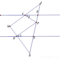 (1)当点P在E、F两点之间运动时,如果α=30°,β=40°,则∠DPC= °.