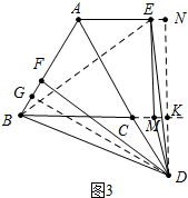 (3)如图3中,作DG⊥AB于G,DN⊥AE于N,DN交BC的延长线于K.设AB=BC=AC=5a,则BG=GF=EN=KM=a,由CK∥AN,推出$\frac{DC}{DA}$=$\frac{CK}{AN}$,列出方程求出a,再利用勾股定理即可解决问题.