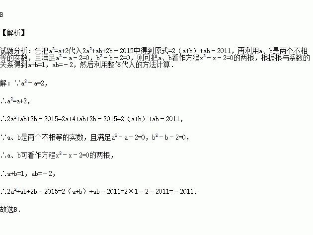 (2015秋•岳池县期末)如果a、b是两个不相等的实数,且满足a2﹣a=2,b2﹣b=2,那么代数式2a2+ab+2b﹣2015的值为( )