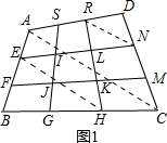 分析 连接RN、AC、EH,如图1,易证RN=$\frac{1}{3}$AC=$\frac{1}{2}$EH,RN∥AC∥EH,进而可证到L是EN、RH的三等分点,同理可得I是EN、SG的三等分点,J是SG、FM的三等分点,K是FM、RH的三等分点.要证S阴影=$\frac{1}{9}$S四边形ABCD,只需证S四边形ILKJ=$\frac{1}{3}$S四边形EFMN,S四边形EFMN=$\frac{1}{3}$S四边形ABCD,连接LJ、EJ、LM、EM,如图2,只需运用等高三角形的面积比等于底的比即可解决问题.
