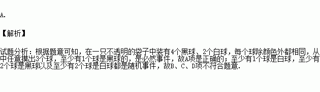 一只不透明的袋子中装有4个黑球、2个白球,每个球除颜色外都相同,从中任意摸出3个球,下列事件为必然事件的是( )