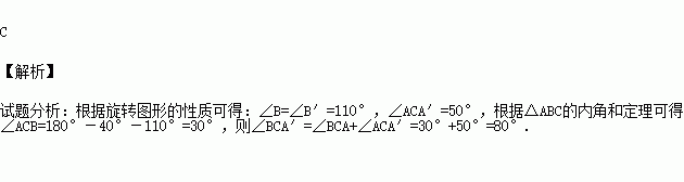 如图,将△ABC绕着点C顺时针旋转50°后得到△A′B′C′.若∠A=40°.∠B′=110°,则∠BCA′的度数是( )