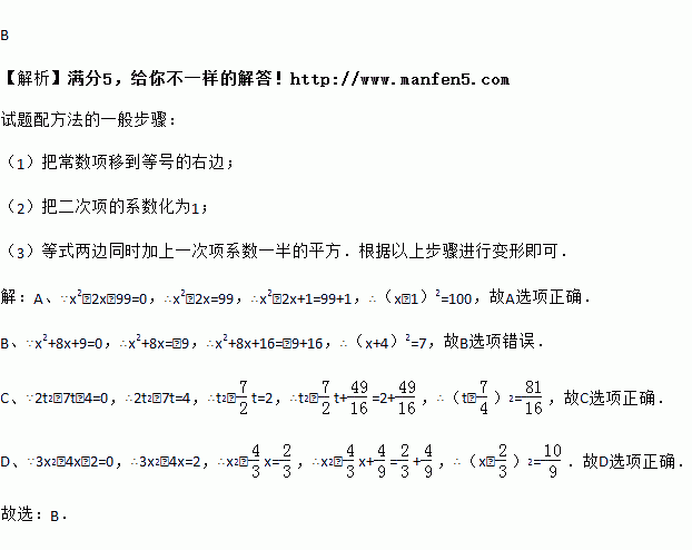 A. x2﹣2x﹣99=0 化为(x﹣1)2=100