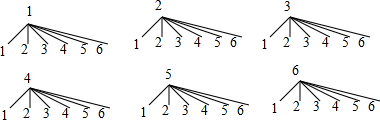 解答 解:画树状图为:共有36种等可能的结果数,其中掷得两个6的结果数为1,所以掷得两个6的概率=$\frac{1}{36}$,所以这一说法是错误的.