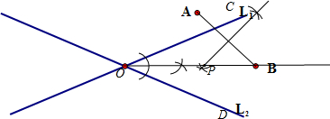 分析:作线段AB的垂直平分线和∠COD的角平分线,交于点P,就是加油站的位置.