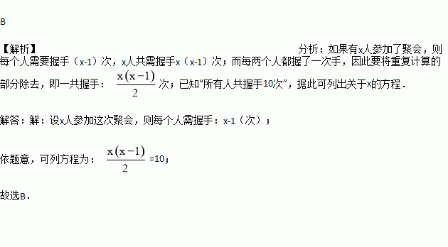 在某次聚会上,每两人都握了一次手,所有人共握手10次,设有x人参加这次聚会,则列出方程正确的是( )