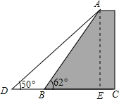 分析:过A点作AE⊥CD于E,在Rt△ABE中,根据∠ABE=62°,求出AE、BE的长度,然后在Rt△ADE中,求出DE的长度,继而可求得BD的长度.
