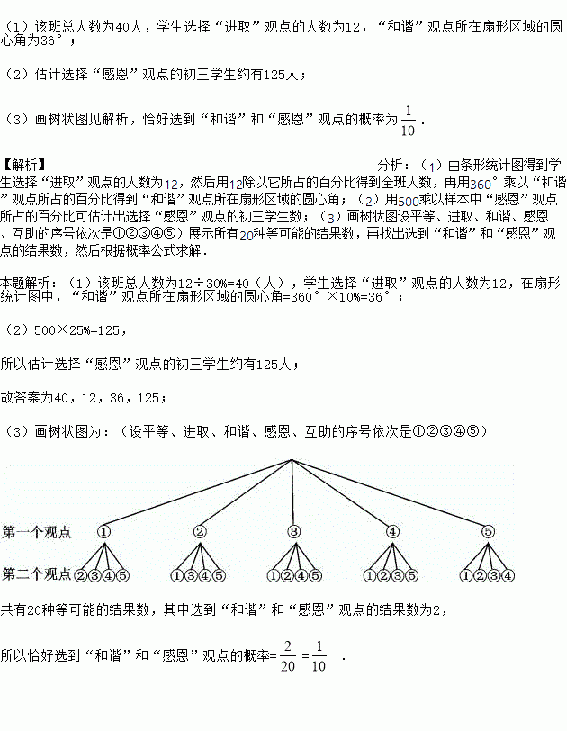 (2)如果该校有500名初三学生,利用样本估计选择“感恩”观点的初三学生约有 人;