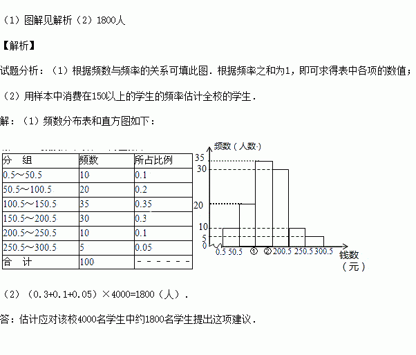 (2)研究所认为,应对消费150元以上的学生提出勤俭节约的建议,试估计应对该校4000名学生中约多少名学生提出这项建议?