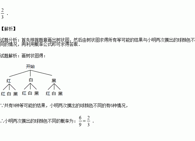 在一个不透明的盒子里有红球、白球、黑球各一个,它们除了颜色外其余都相同.小明从盒子里随机摸出一球,记录下颜色后放回盒子里,充分摇匀后,再随机摸出一球,并记录下颜色.请用列表法或画树状图(树形图)法求小明两次摸出的球颜色不同的概率.