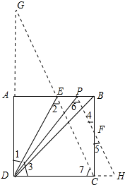 分析 连接CE并延长交DA的延长线于G,取BC的中点F,连接PF交DC的延长线于H,先证△ADE≌△BCE,得出DE=CE,再证明△AGE≌△BCE,得出GE=CE,得出GE=DE,证出∴∠2=2∠1,然后证明△PBF≌△HCF,得出PB=CH,设正方形边长为4,则AP=3,根据勾股定理求出PD,再得出PD=DH,证出∠3=180°-2∠H,由DE=CE,进一步证出∠3=2∠1,即可得出结论.