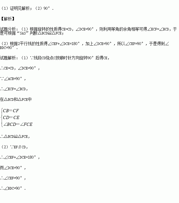 如图,在Rt△ABC中,∠ACB=90°,点D、F分别在AB、AC上,CF=CB,连接CD,将线段CD绕点C按顺时针方向旋转90°后得CE,连接EF.