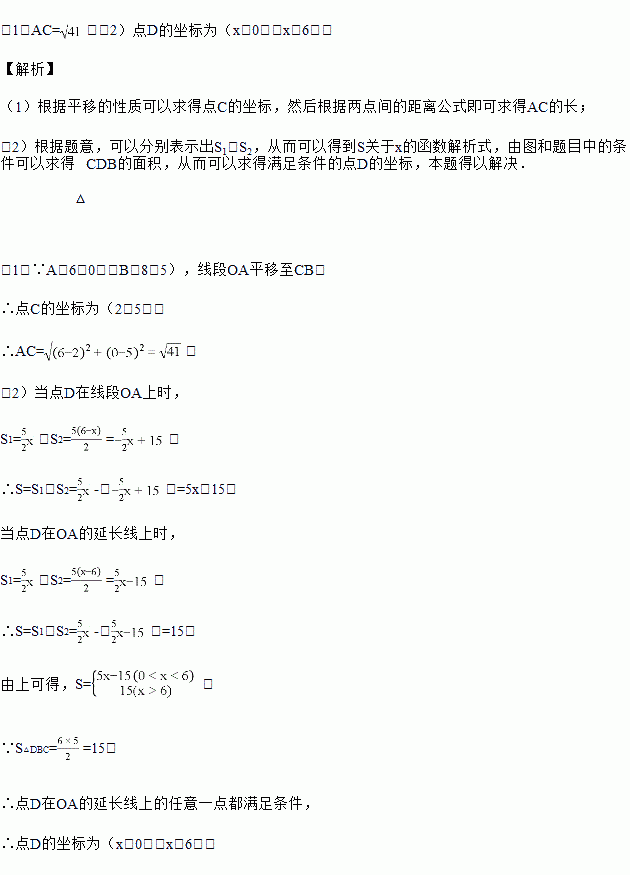 如图,已知A(6,0),B(8,5),将线段OA平移至CB,点D在x轴正半轴上(不与点A重合),连接OC,AB,CD,BD.