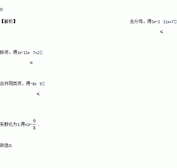 ①去分母,得3x-2≤11x+7,