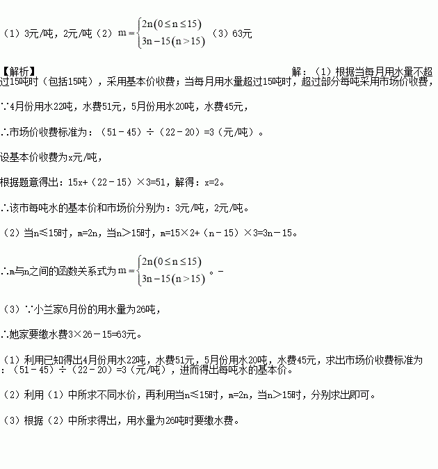为鼓励居民节约用水,某市决定对居民用水收费实行“阶梯价”,即当每月用水量不超过15吨时(包括15吨),采用基本价收费;当每月用水量超过15吨时,超过部分每吨采用市场价收费.小兰家4、5月份的用水量及收费情况如下表: